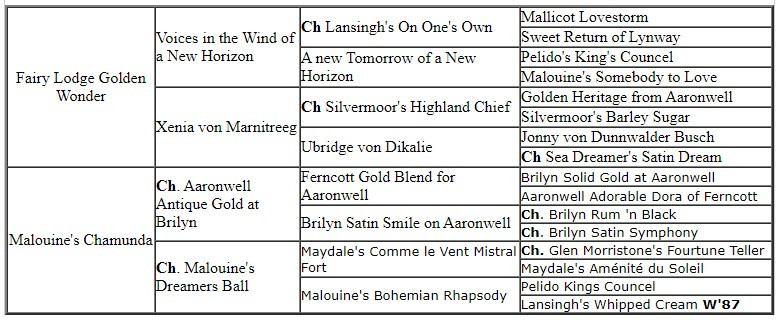 Sire: Fairy Lodge Golden Wonder Dame: Malouine's Chamunda